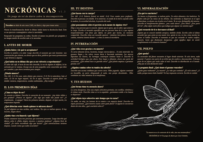 NECRÓNICAS es un juego de rol de diario donde narras la descomposición de un cadáver —el tuyo— desde el último latido hasta convertirte en polvo.